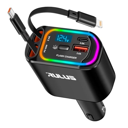 RULUS Upgrade 4 in 1 Retractable Charger for Car, PD 65W Fast Car Phone Charger with 2 Charging Cables and 2 USB Ports, 12-24V Voltage Display for iPhone 16/15/14/Carplay/Samsung Galaxy/iPad/AirPods